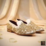 Command attention with Ruby Royals’ Majestic Ornate Collection, a true embodiment of royal elegance and fine craftsmanship. These ivory suede slip-ons feature an elaborate antique dabka and tilla embroidery, accentuated with hand-set gem embellishments that bring a regal sparkle to every step. The intricate Maharaja crest design evokes timeless grandeur, blending heritage artistry with a modern silhouette.