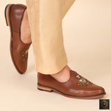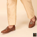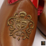 Majestic Ornate – Shahi Shield Crest Tan Leather Mojari | Ruby Royals