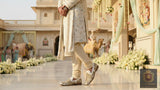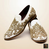 Command attention with Ruby Royals’ Majestic Ornate Collection, a true embodiment of royal elegance and fine craftsmanship. These ivory suede slip-ons feature an elaborate antique dabka and tilla embroidery, accentuated with hand-set gem embellishments that bring a regal sparkle to every step. The intricate Maharaja crest design evokes timeless grandeur, blending heritage artistry with a modern silhouette.